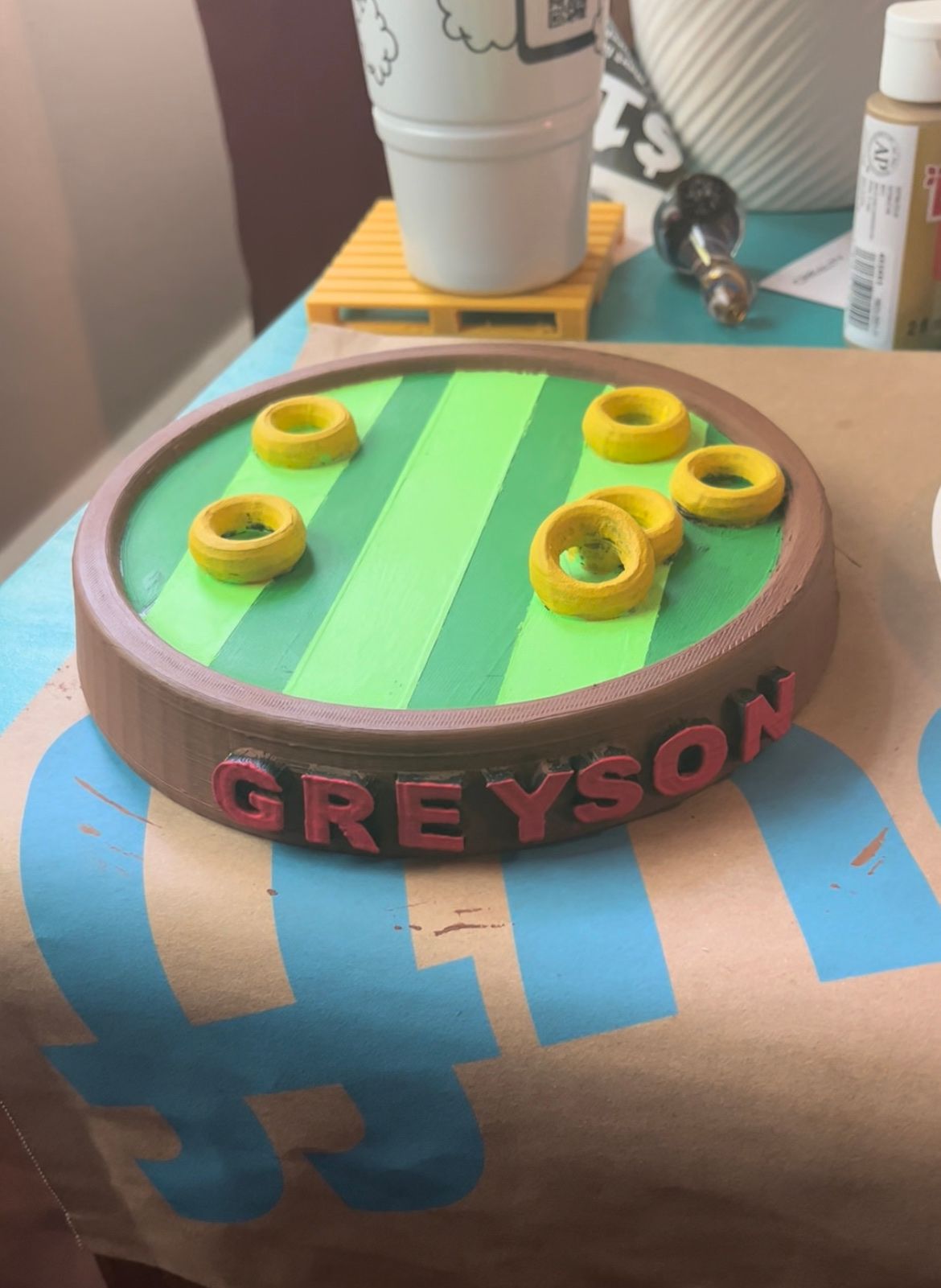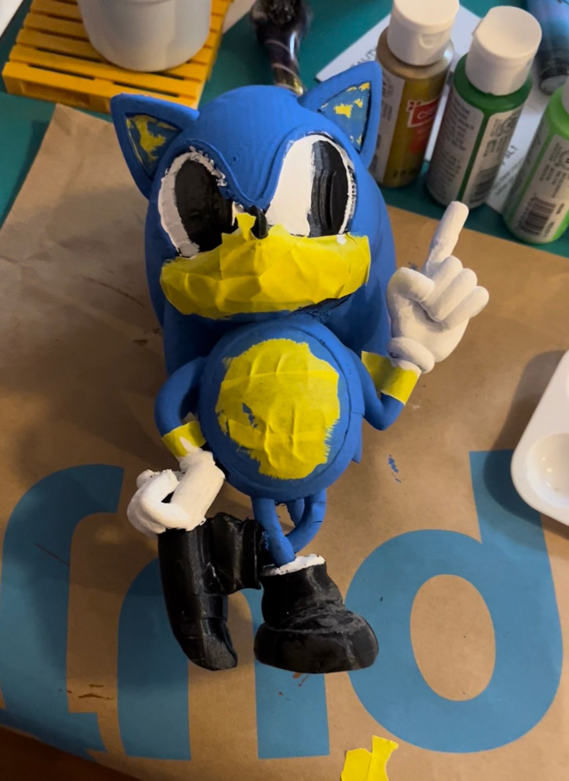 With all the time saved, we still managed to get holes in the full-size Sonic when removing support. Air dry modeling compound solves this problem. After packing the holes and letting them dry for 48 hours, we sanded the spots down until smooth. The painting ultimately took the longest time due to a lack of primer, causing a need for several layers of paint. After 40 hours of printing, 3 test models, and countless days of painting, Sonic was complete!